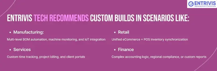 For these situations, our experts at Entrivis Tech recommend strategic customization — enhancing standard modules without overcomplicating the system. This hybrid approach delivers speed and flexibility.