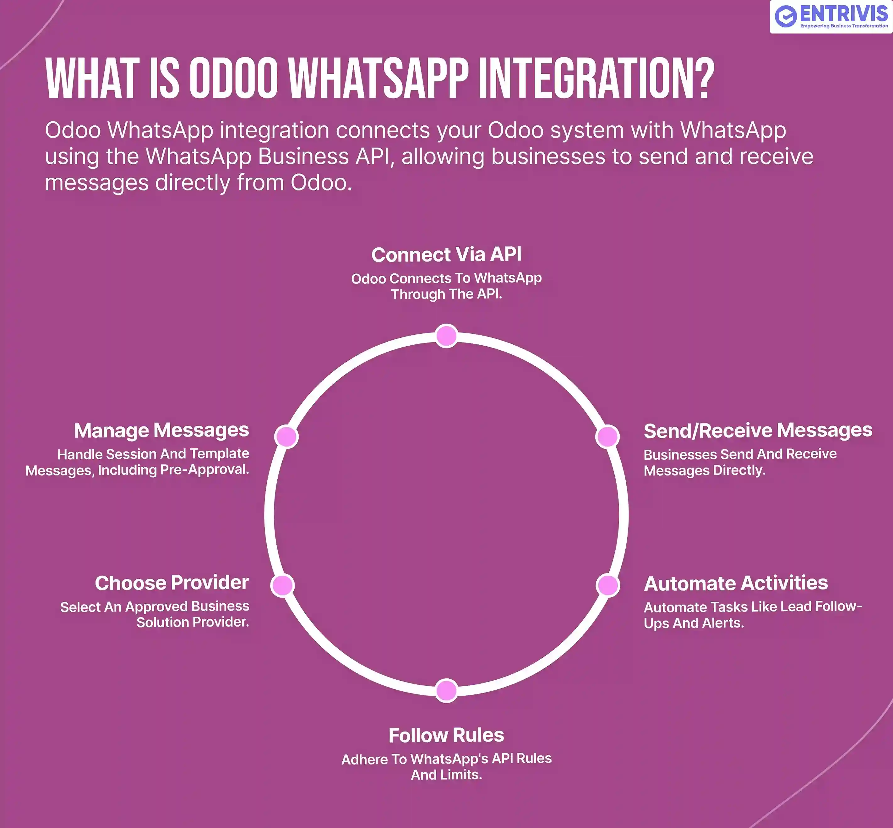Entrivis Tech Pvt Ltd helps businesses design, integrate, and scale WhatsApp inside Odoo based on real workflows, compliance requirements, and usage volume. From choosing the right API provider to building automation and controlling costs, the focus is on a setup that works in production, not just on paper.